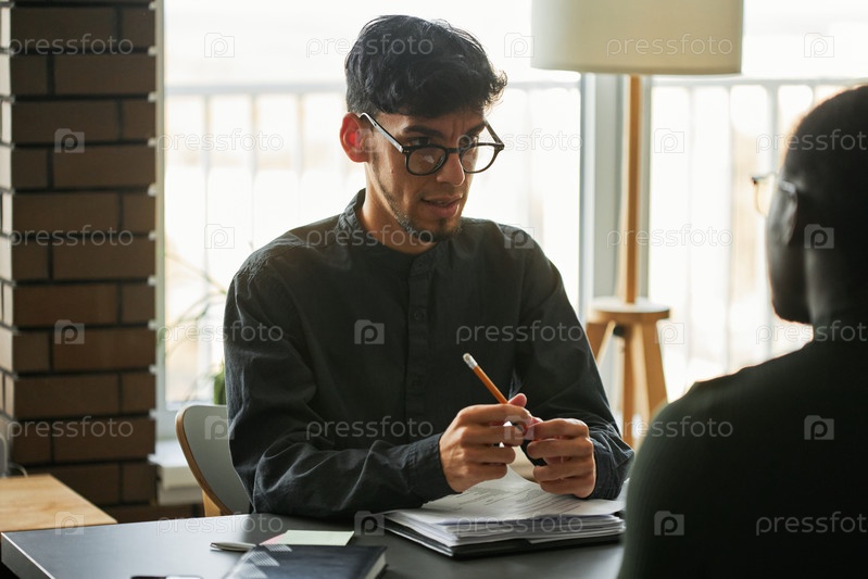 Специалист по персоналу сидит перед молодым чернокожим мужчиной, задавая вопросы о предыдущей работе