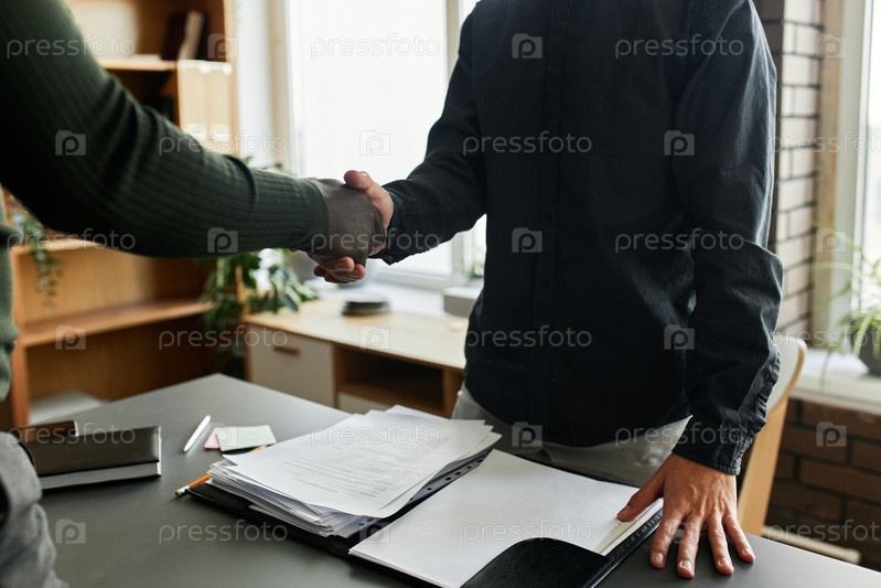 Различные коллеги, стоящие за столом и приветствующие друг друга рукопожатием