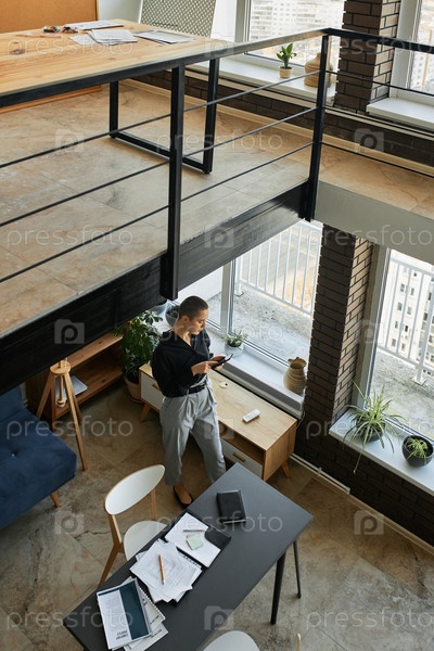 Женщина с короткими волосами работает в современном офисе на чердаке, используя смартфон