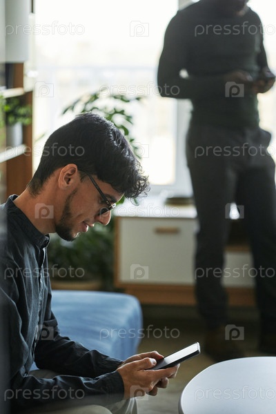 Мужчина в очках сидит на диване в офисе, общаясь в мессенджере с коллегой по смартфону