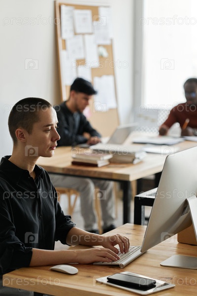 Молодая женщина, сидящая за столом в современном офисе, работает на настольном компьютере