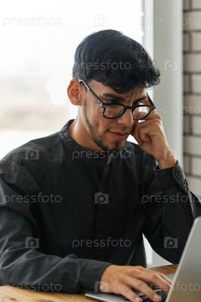 Бизнесмен, сидящий за столом в офисе и работающий над сложной задачей с помощью ноутбука