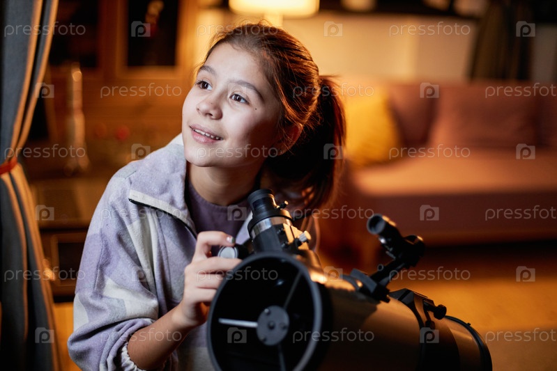 Девочка, заинтересованная астрономией, изучает звезды и планеты с помощью телескопа