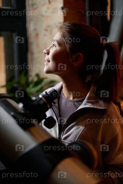 Девушка, интересующаяся астрономией и смотрящая из окна на звезды вечером