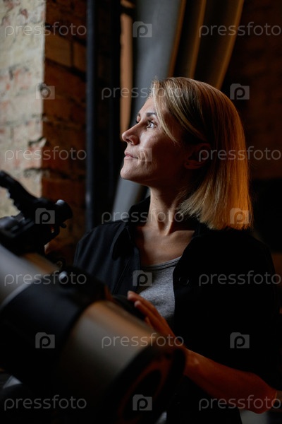 Зрелая женщина изучает астрономию, глядя на ночное небо