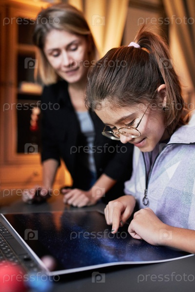 Женщина помогает своей радостной дочери с домашним заданием по астрономии