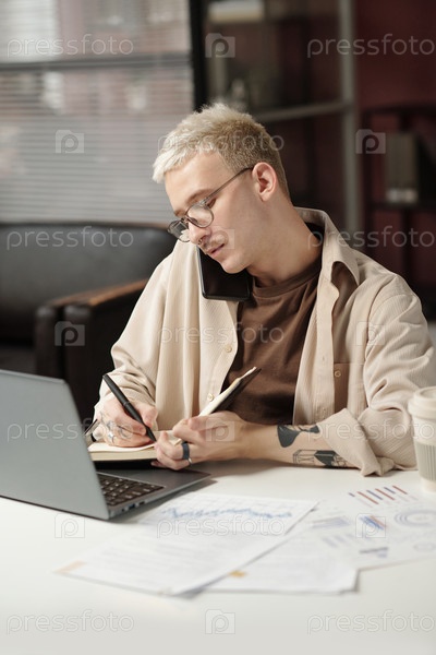 Молодой человек разговаривает по телефону и делает заметки
