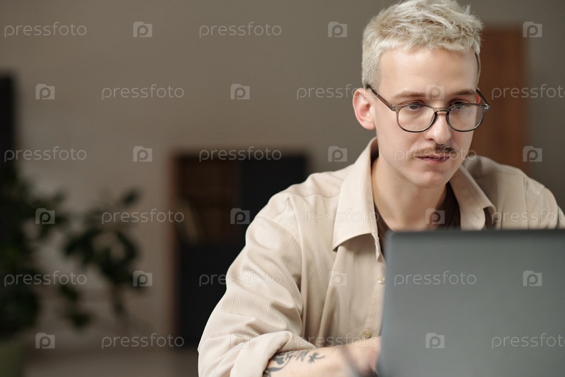 Молодой человек использует ноутбук на работе в офисе