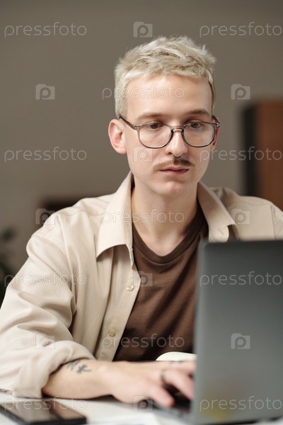 Мужчина из поколения Z использует ноутбук на работе в офисе