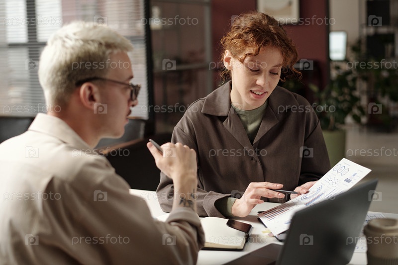 Мужчина и женщина поколения Z используют графики в офисе