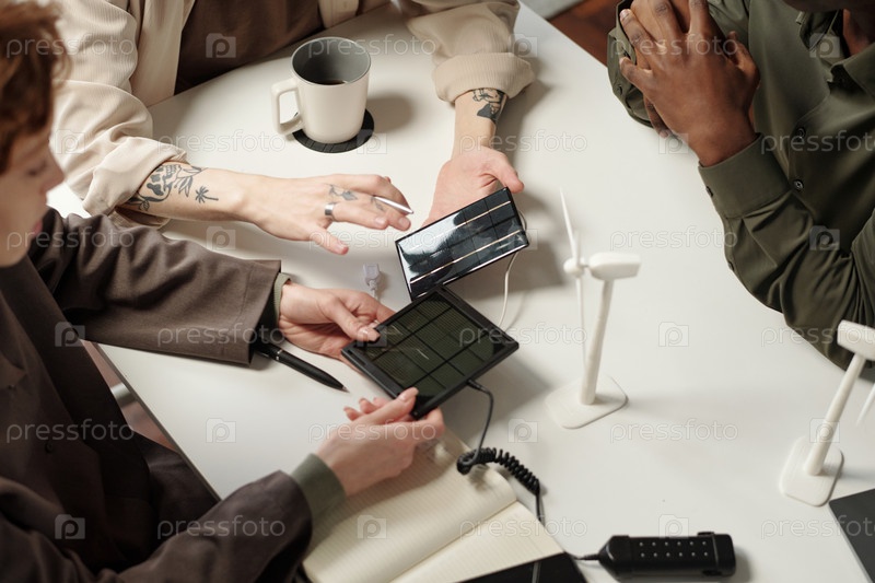 Непризнанные люди, обсуждающие технологии возобновляемых источников энергии на работе