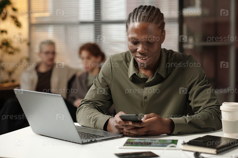 Gen Z Черный мужчина использует смартфон на рабочем месте
