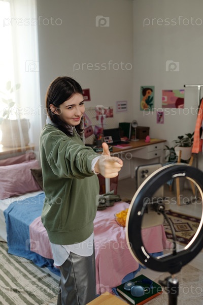 Молодая женщина улыбается и жестикулирует Пальцы вверх во время записи видео