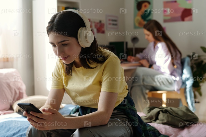 Девушка-подросток слушает музыку на наушниках, используя смартфон