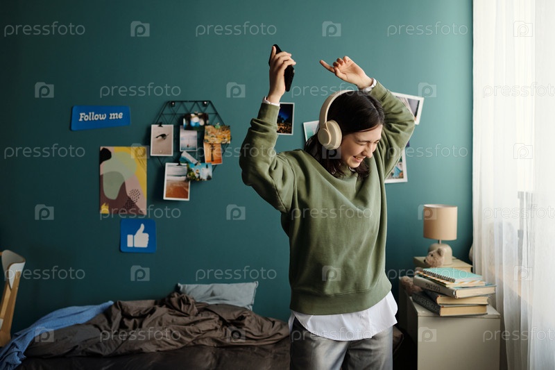 Подростковая девушка слушает музыку и танцует с наушниками на