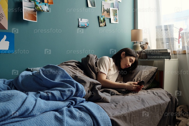 Девушка-подросток, лежащая в постели с помощью смартфона в уютной спальне