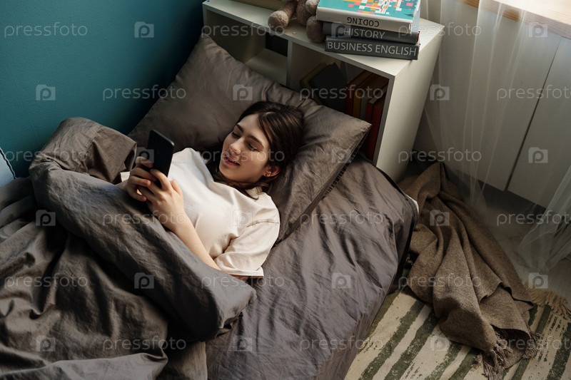 Девушка-подросток, лежащая в постели с помощью смартфона утром