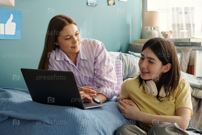 Подростки вместе используют ноутбук, отдыхая в спальне