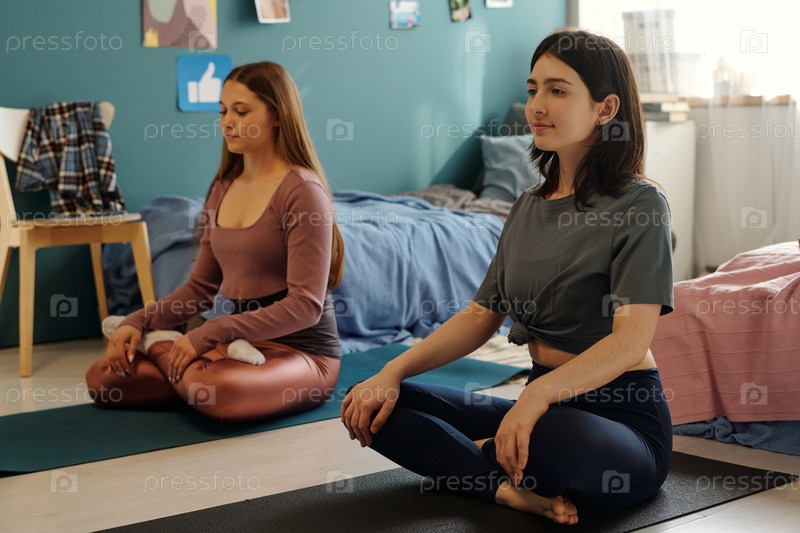 Две молодые женщины практикуют медитацию йоги в общей спальне