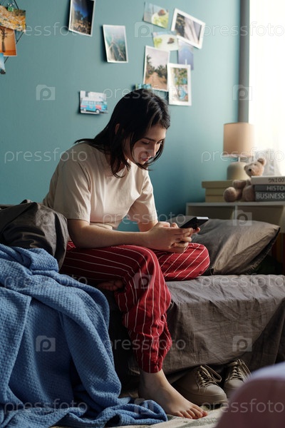 Девушка-подросток сидит на кровати, используя смартфон в уютной обстановке спальни