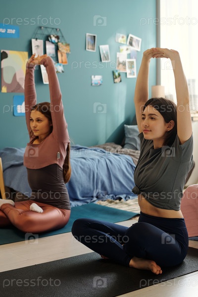Две девочки-подростки, занимающиеся сидячей йогой и растяжными упражнениями в помещении вместе