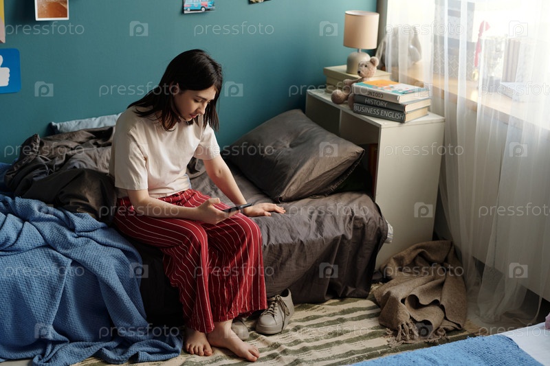 Девушка-подросток сидит на кровати, читает сообщения на экране смартфона