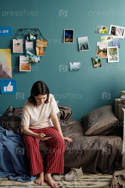 Девушка-подросток сидит на кровати и просматривает социальные сети на смартфоне