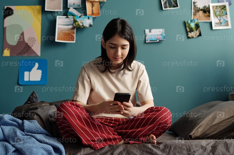 Девушка-подросток, сидящая с перекрещенными ногами и использующая смартфон в спальне