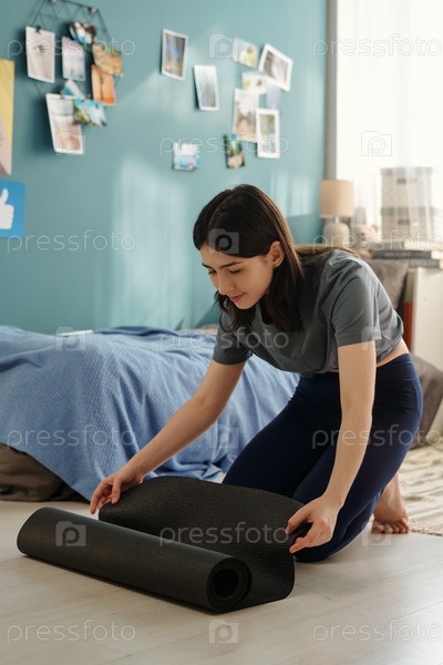 Молодая женщина готовит йога-матку для домашней тренировки в спальне