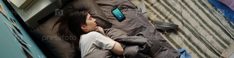 Молодая женщина спит в постели, рядом с ней звонит смартфон