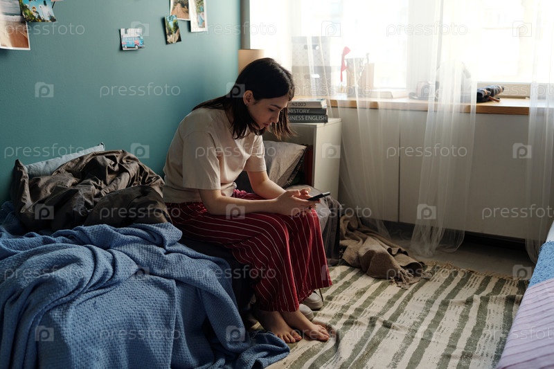 Девушка-подросток сидит в помещении, используя смартфон в спальне