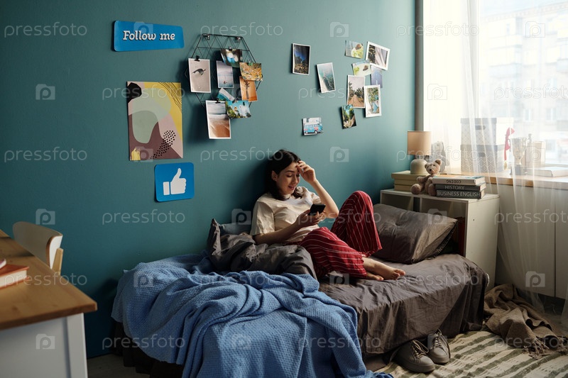 Девушка-подросток сидит на кровати, используя смартфон в уютной спальне