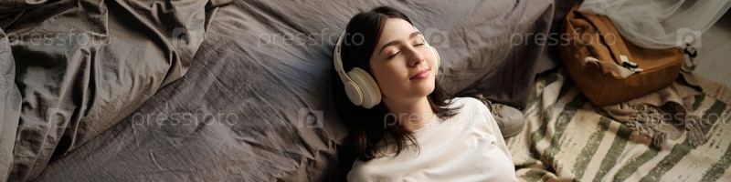 Молодая женщина отдыхает в постели, слушая музыку с наушниками