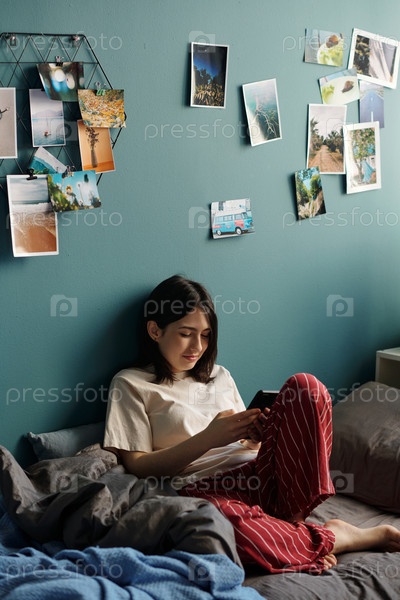 Девушка-подросток отдыхает на кровати, используя смартфон в уютной спальне