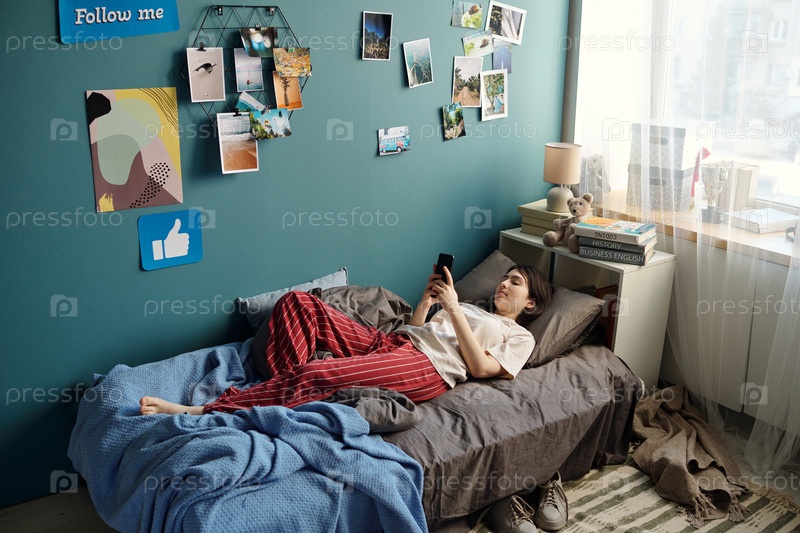 Девушка-подросток, лежащая на кровати, отправляет сообщения друзьям по смартфону утром