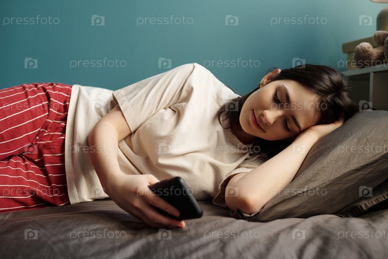 Молодая женщина, лежащая на кровати с помощью смартфона и отдыхающая в помещении
