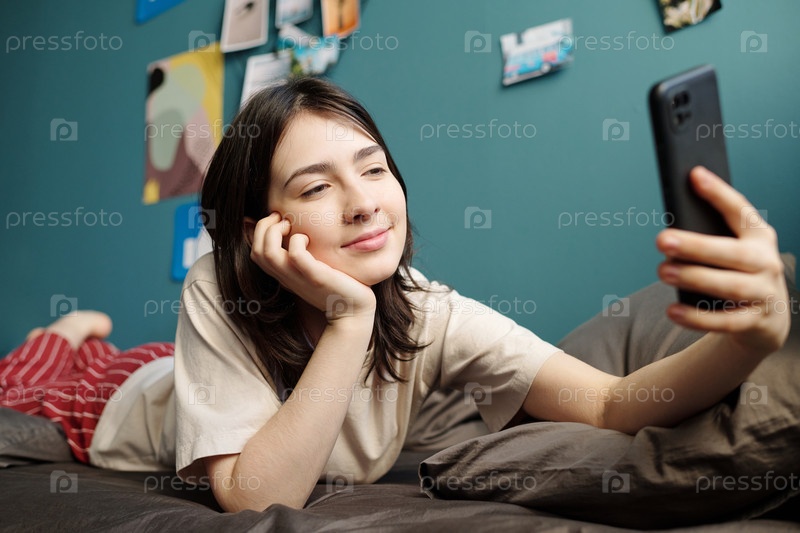 Подростковая девушка улыбается, лежа на кровати с помощью смартфона
