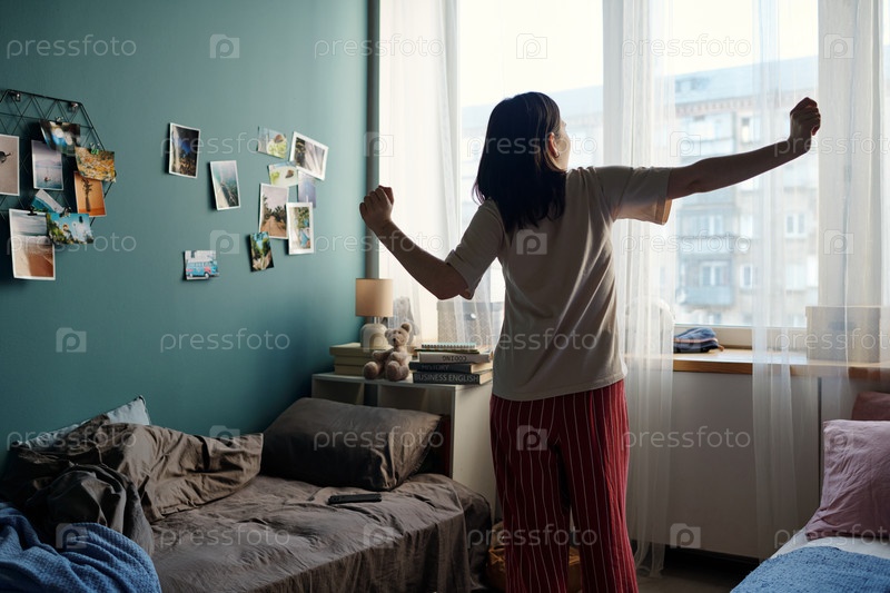 Молодая женщина растягивает руки, стоя рядом с окном утром