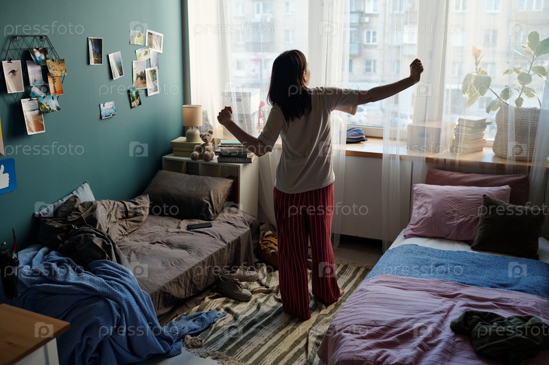 Молодая взрослая женщина растягивает руки, стоя возле окна