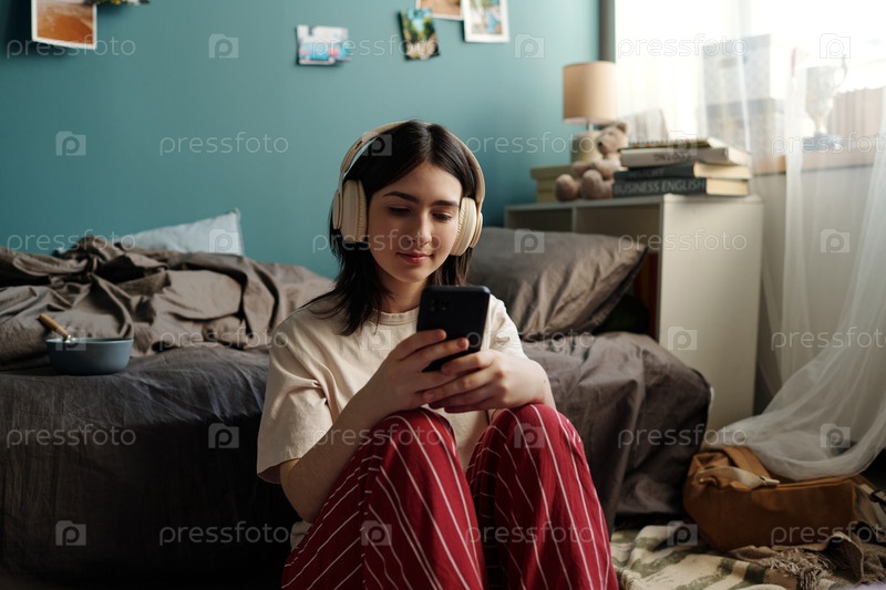 Девушка-подросток, которая носит наушники и наслаждается музыкой на смартфоне в помещении