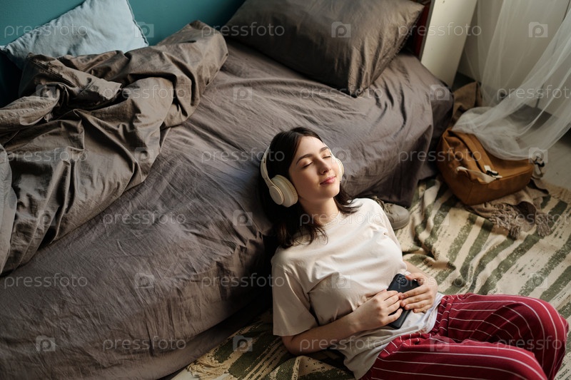 Девушка-подросток отдыхает на полу, слушая музыку с наушниками