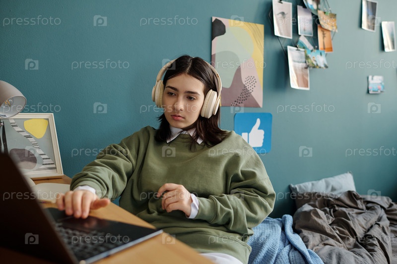 Девушка-подросток носит наушники, используя ноутбук во время учебы в помещении