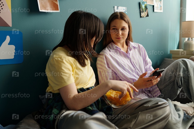Подростки сидят в помещении, общаются и используют смартфоны вместе