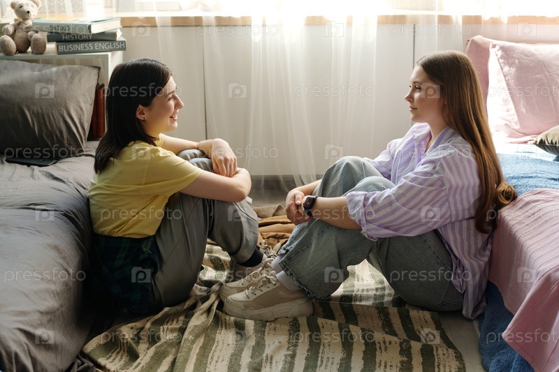 Две молодые взрослые женщины сидят на полу и разговаривают в уютной спальне