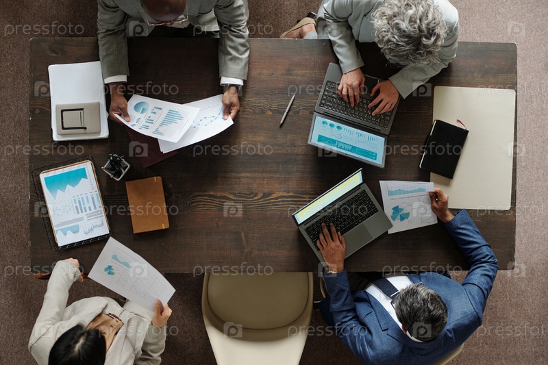 Разнообразная группа специалистов среднего возраста, анализирующих финансовые отчеты