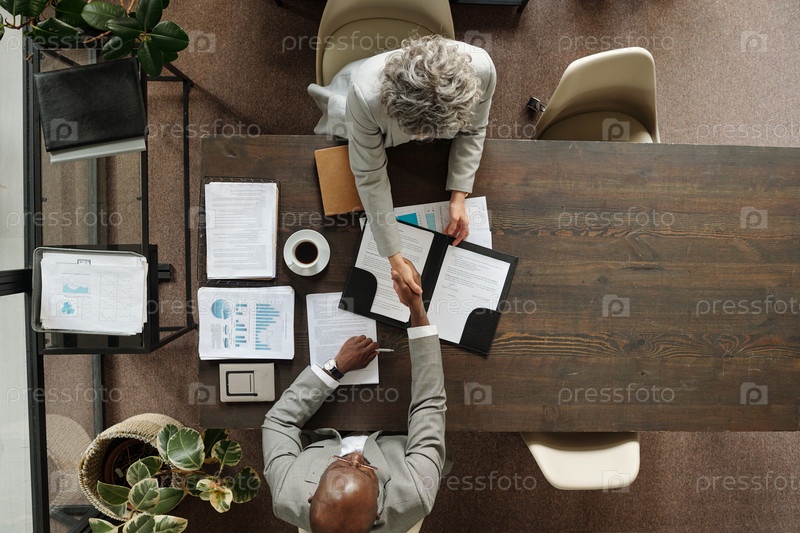 Женщина и чернокожий мужчина среднего возраста пожали друг другу руки во время встречи старших