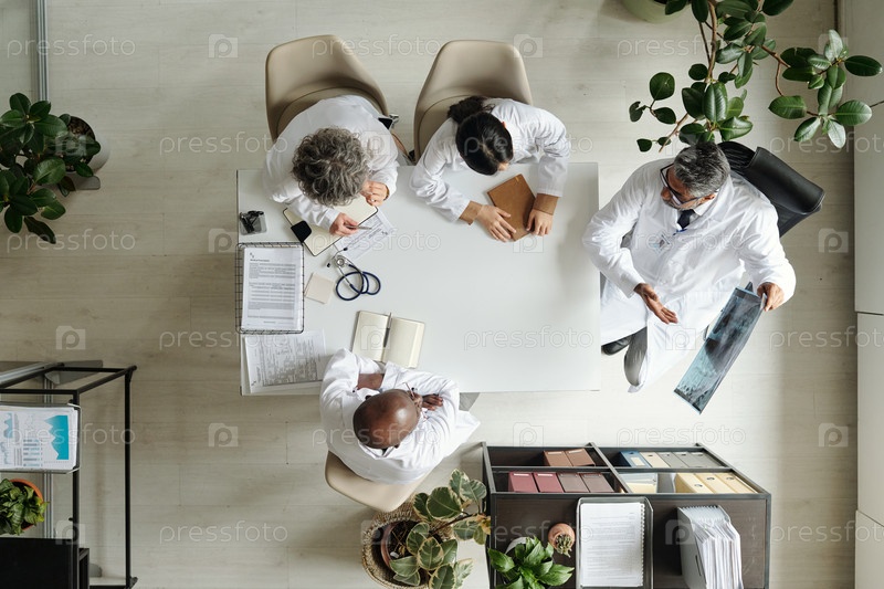 Мультиэтническая медицинская группа среднего возраста обсуждает результаты рентгеновских лучей вместе