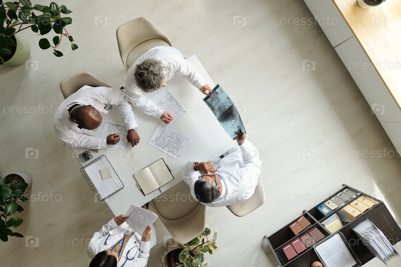Группа врачей среднего возраста из разных этнических групп, вместе рассматривающих медицинские рентгеновские лучи