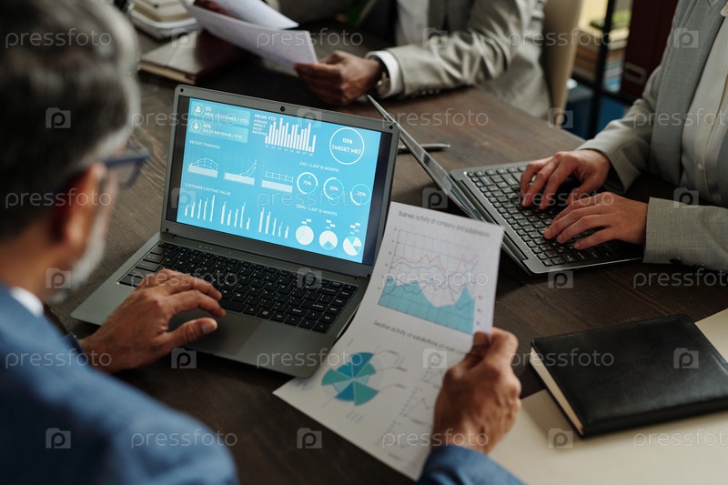 Мужчина средних лет анализирует финансовые данные с коллегами в офисе