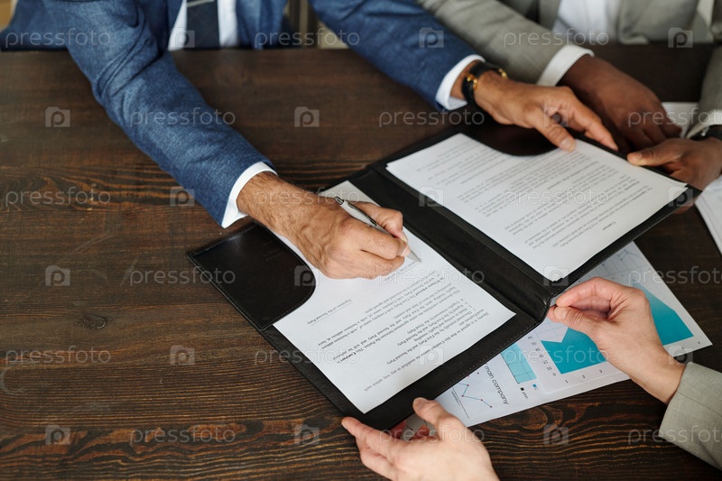 Мужчина подписывает контракт с чернокожим мужчиной и женщиной, наблюдающими